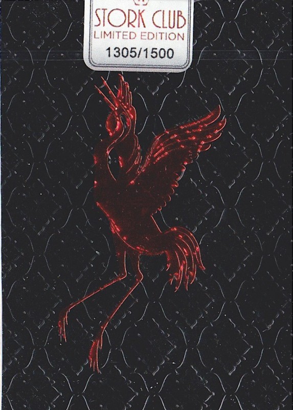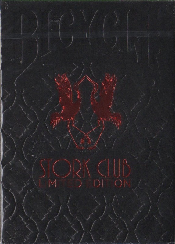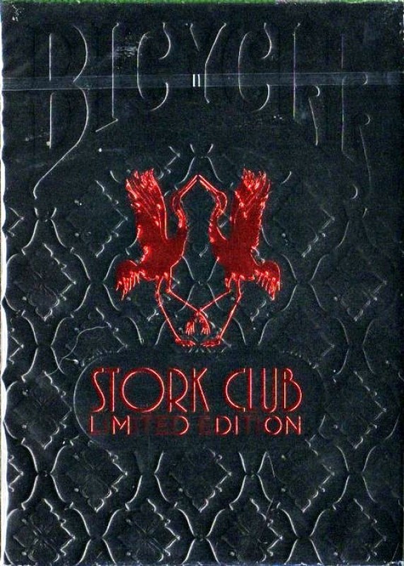 Funded as a Kickstarter project on July 22, 2014 with $53,355 pledged from 756 backers, this was ultimately a set of 6 decks, some with custom cards and some tuck swaps, plus uncut sheets and varied non-deck add ons. Using the 1920s-30s mobster era as inspiration, this USPCC deck series consists of the Gold and Silver decks, later followed by limited edition Cotton Club and Stork Club decks (1,500 each) which were tuck swaps and finally the limited editions of Empire and Kingpin (1,250 each) which were fully different decks (face cards, backs and tuck). While the decks were designed, submitted and copyright 2014 they were not printed or delivered until early 2015. This PCDB Entry is for the 1,500 limited edition Bicycle branded Stork Club deck. They featured the same cards as the standard gold/silver decks, but were in a different tuckbox (tuck swap) and also came with a similar themed coin which were also numbered and signed. Like the other limited decks in this series, they also used serialized seals on the decks. https://www.kickstarter.com/projects/crookedkings/get-made-mob-themed-uspcc-bicycle-playing-card-dec/