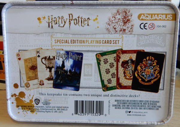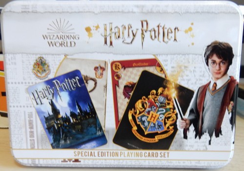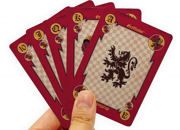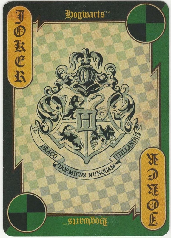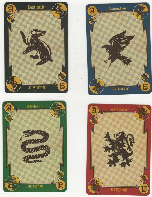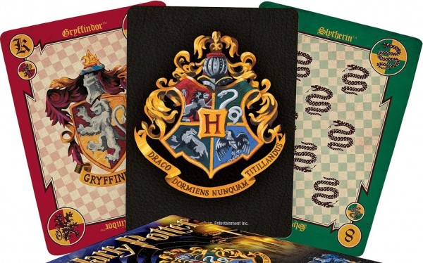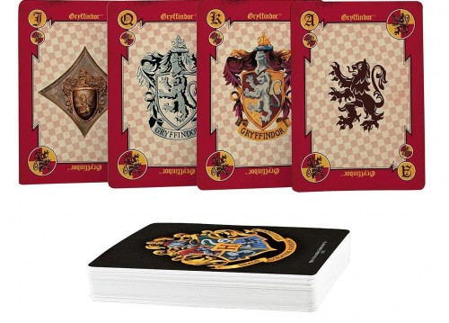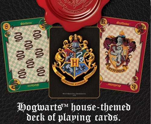 Part of a 2 deck set of Harry Potter cards from Wizarding World. Made by Aquarius. Instead of standard playing card suits, the suits are the 4 house crests from Hogwarts, Gryffindor, Slytherin, Ravenclaw, and Hufflepuff. Also available as an individual deck.