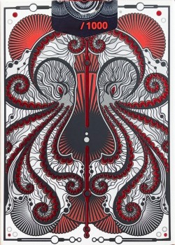 Helike is a deck of 55 poker format cards released in a light gray color version with extra red matte edges. Packed in a tuck box sealed with a unique number (001-500).