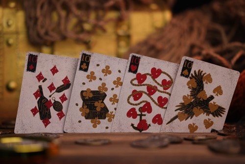 The court cards of the Standard Editions adopt a more minimalist approach, featuring stark, skeletal graphics. This simpler design choice starkly complements the ornate cards of the special editions, providing a visual representation of the skeletal remains of piracy‘s past, stripped to the bare bones yet striking in their eerie simplicity.