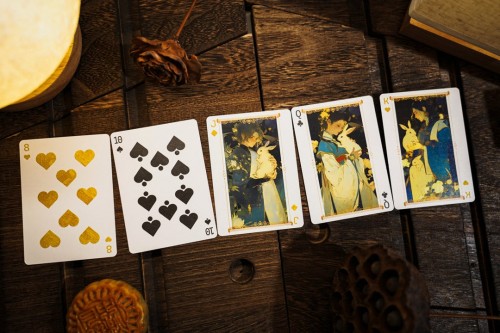 Great care has been taken to blend traditional elements into the card faces, which feature customized designs for both the court cards and the pips. Each court card is displayed against a scroll-like background, with the characters dressed in traditional attire. The intricate ancient patterns on the garments symbolize harmony and beauty.