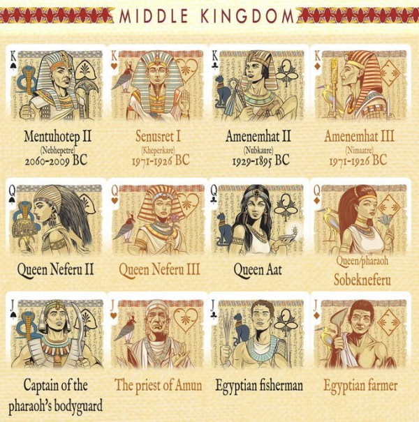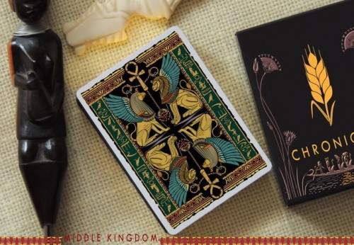 The Chronicles Series: Egypt Playing Cards is a set of three meticulously crafted decks, each inspired by one of the main periods of ancient Egypt: the Old Kingdom, Middle Kingdom, and New Kingdom. The Middle Kingdom tuck box features a wheat head foiled in gold, representing the agricultural revolution driven by irrigation, crucial for Egypt's growth during the Golden Age. The map on the back showcases Thebes, the political and cultural center, as Egypt expands further up the Nile River during the Middle Kingdom.