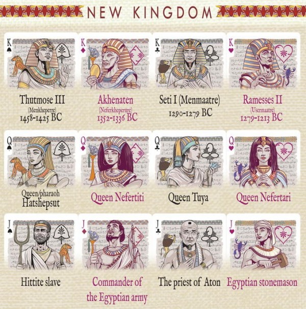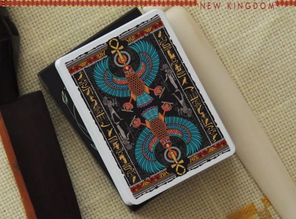 The Chronicles Series: Egypt Playing Cards is a set of three meticulously crafted decks, each inspired by one of the main periods of ancient Egypt: the Old Kingdom, Middle Kingdom, and New Kingdom. The new kingdom tuck box showcases an axe and sword, foiled to capture the gleaming edge of sharpened iron. These symbols represent Egypt's pivotal transition from the Bronze Age to the Iron Age and its era of expansive empire building.