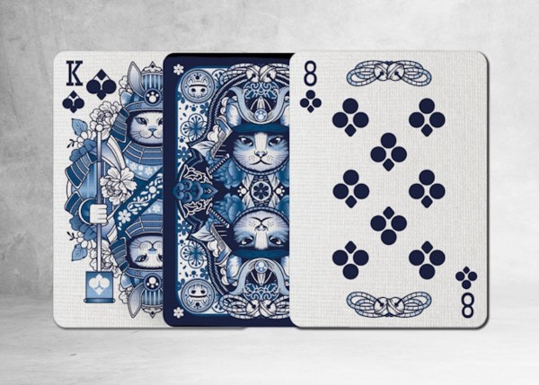 Each card features intricate designs inspired by traditional Japanese ceramics, known for their delicate beauty and timeless appeal. The artwork, characterised by its detailed blue-and-white patterns reminiscent of classic porcelain, also incorporates modern twists that pay homage to the colourful stories of samurai.