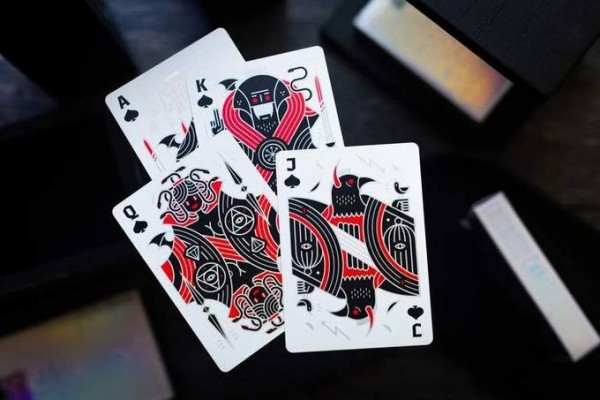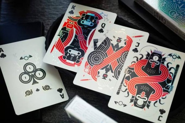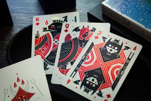 Chaos Playing Cards features mythological theme and the concept of CHAOS! The Aces features enlarged customized pip, with each suit shows the characteristics of one of the four realms found in the Realm of Chaos. The Number Pips features customized pips that both features faces inside along with some symbols. The Courts feature some of the famous mythological creatures exist in legends. There are 4 Joker Cards - 2 of them features the main deities of the Realm: The Cat who wants Chaos and The Goddess who wants Order. The cards feature holographic silver cold foil on both sides. Cards are printed by Kingstar
