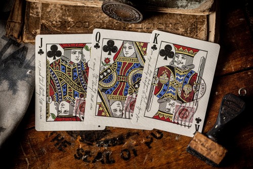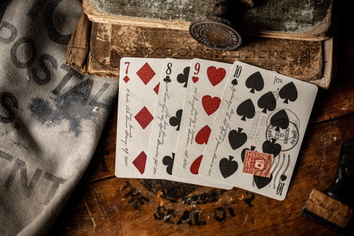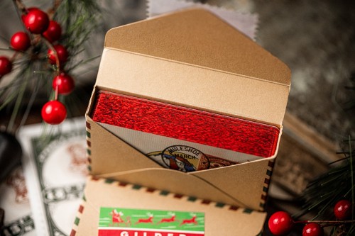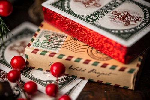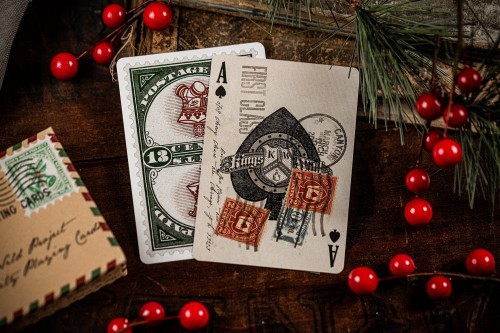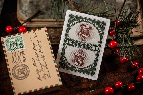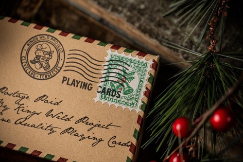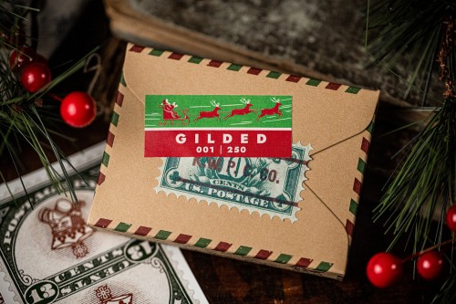This is Postage Paid 2024 Playing Cards tailored for the Christmas Season. For this seasonal variant, the back design color is turned to dark forest green, and the tuck box's envelope design has the Christmas holiday theme elements: jingle bells postage stamp, KWP's logo wearing santa's hat, and the red and green stripes frame. For Gilded Editions, there is the custom numbered sticker featuring the illustration of Santa riding the sleight pulled by his reindeers.
