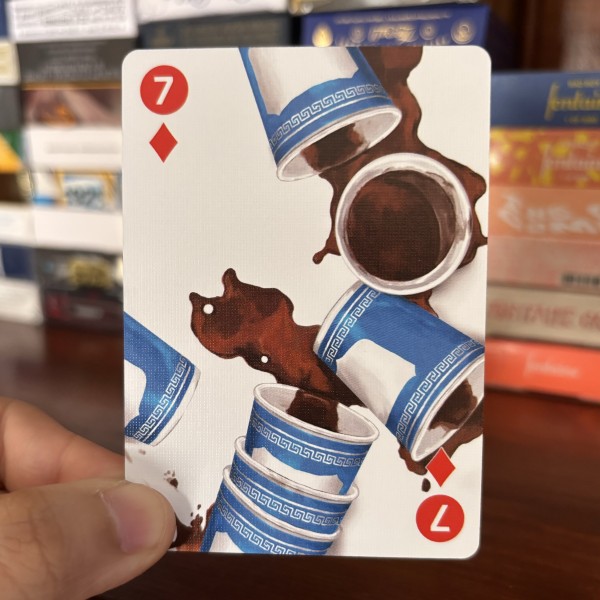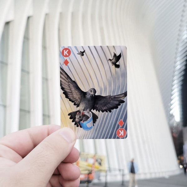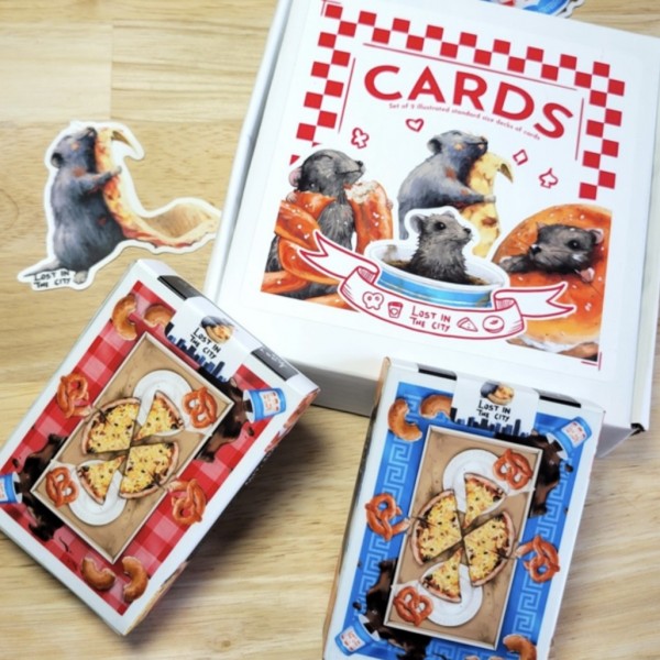 This is the Lost in the City deck of cards. A standard size deck that is all about street food and an adorable city rat exploring the big city. This is a fully illustrated deck, so it's packed with original art. Here the suits are represented by different iconic street food: Bagels, pretzels, cups of coffee and slices of pizza.