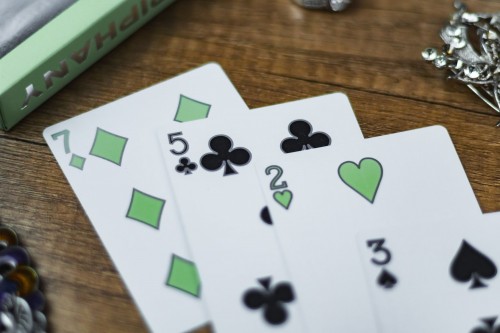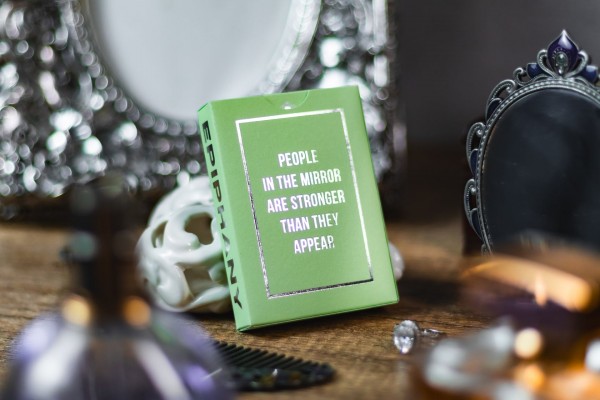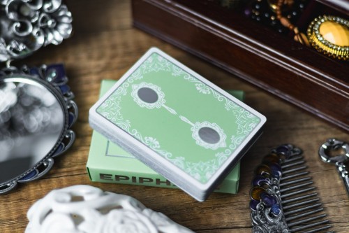 Epiphany features pastel green color scheme for the tuck box and red suit cards.