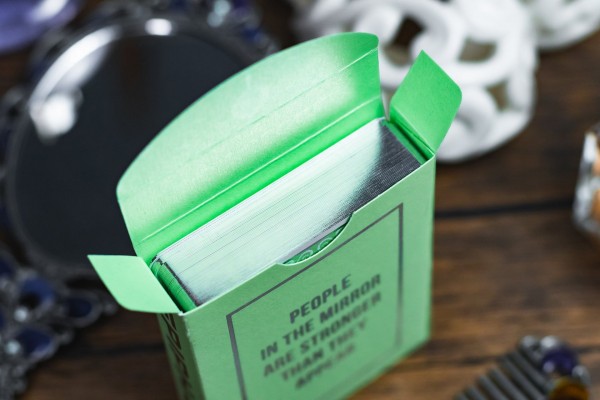 Epiphany features pastel green color scheme for the tuck box and red suit cards. The cards are gilded with silver foil.