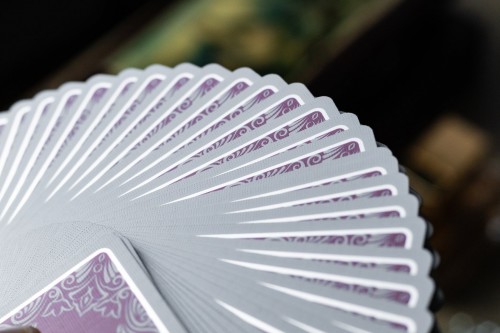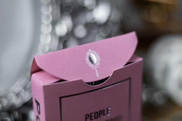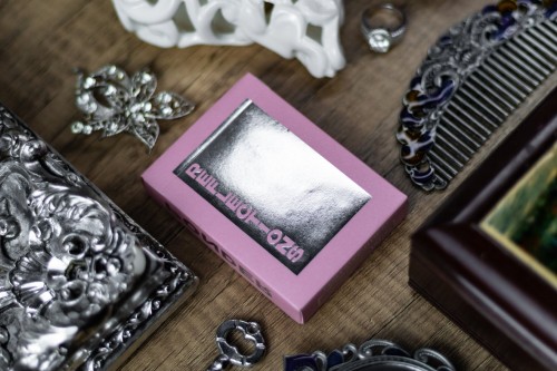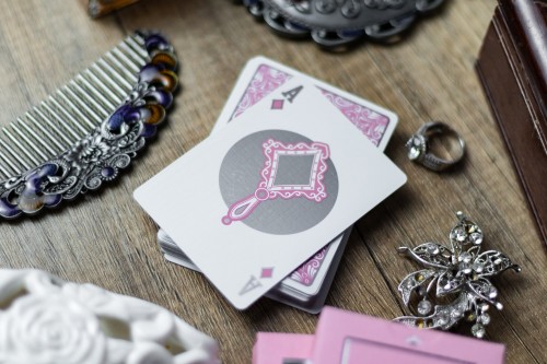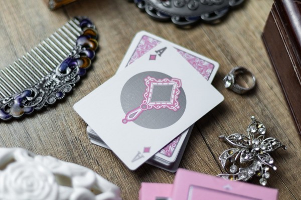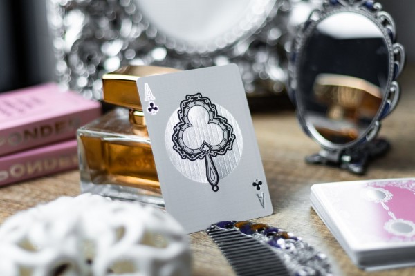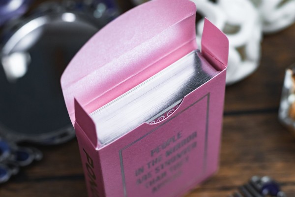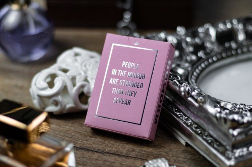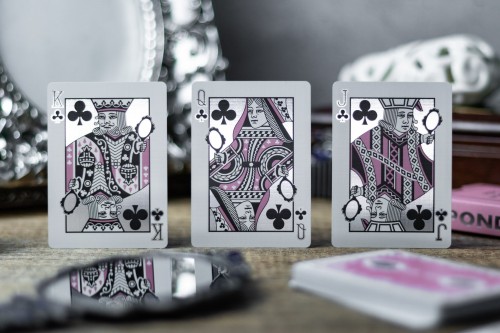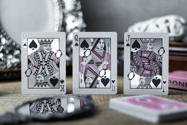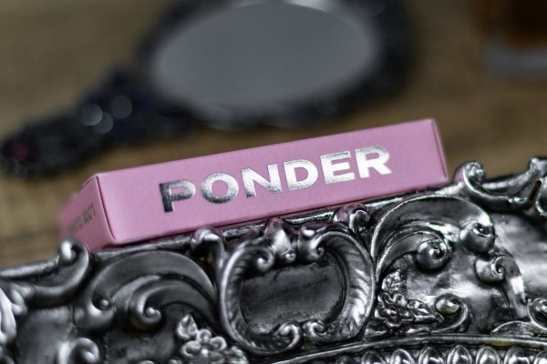 Ponder features pastel pink color scheme for the tuck box and red suit cards. The cards are gilded with silver foil.