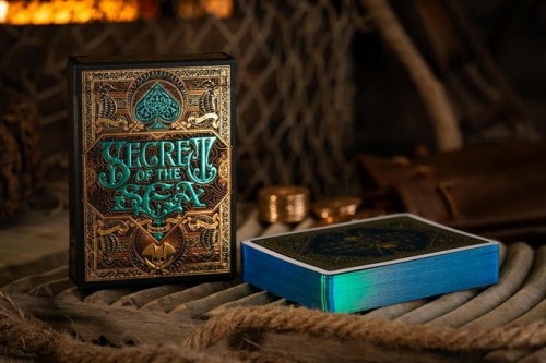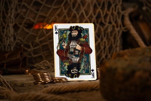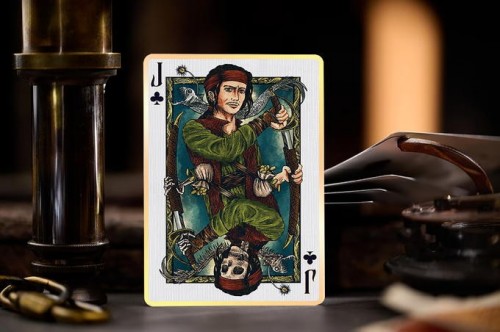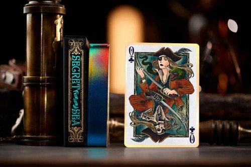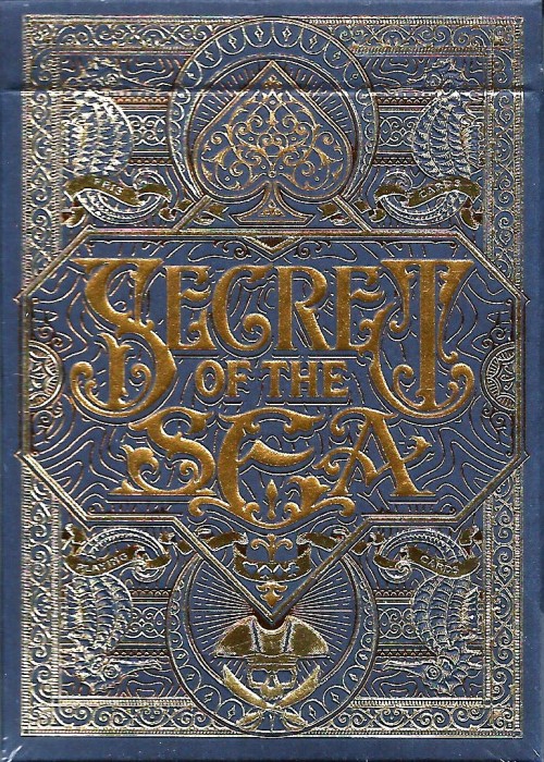 A marvellous pirate deck featuring three layers of hot foil and embossing on the tuck, with one of the foil changes color when viewed on different angle. The cards are printed on premium stock and features PET + Gold Hot Foil. In this edition, the beautiful Courts illustration are in full color. The back design has a slight altercation: the corners have the Kraken illustration done in ornato style. The back and front side of the cards will have gold foil edge border. Also, the cards have gold foil on the details of the artworks on front side along with the interior artworks in the custom pips. In addition, the cards are gilded with blue holographic foil.