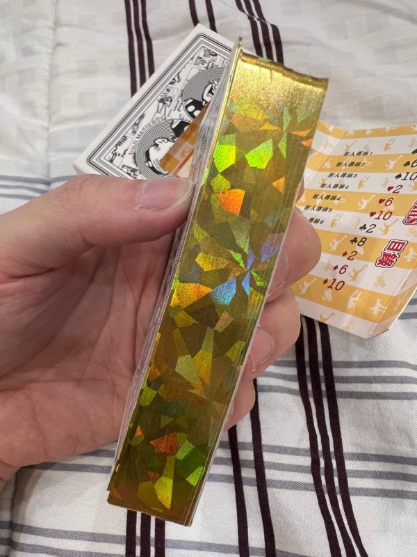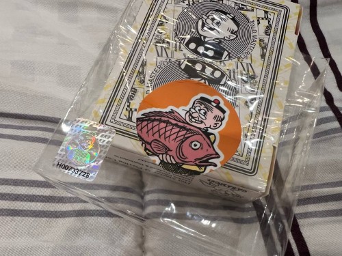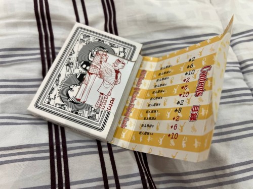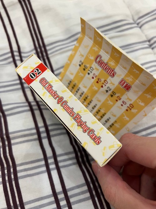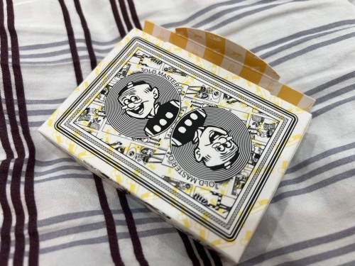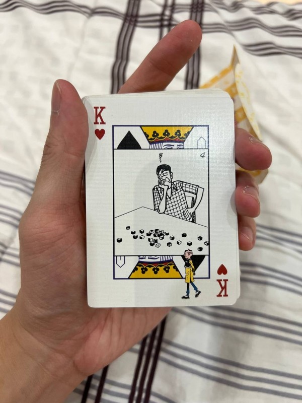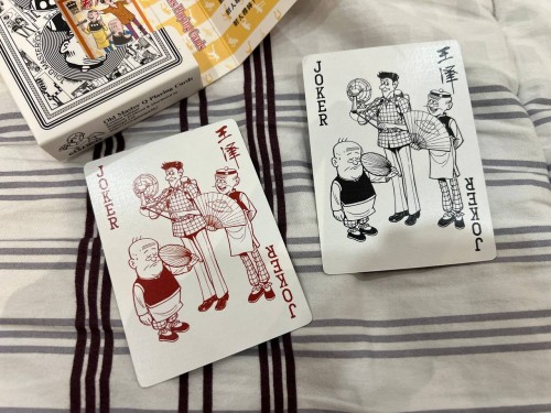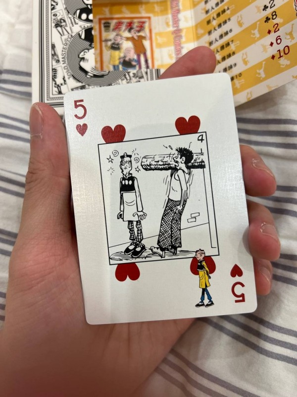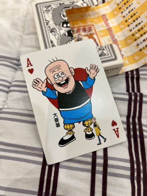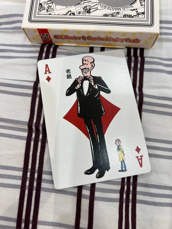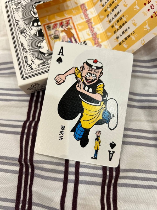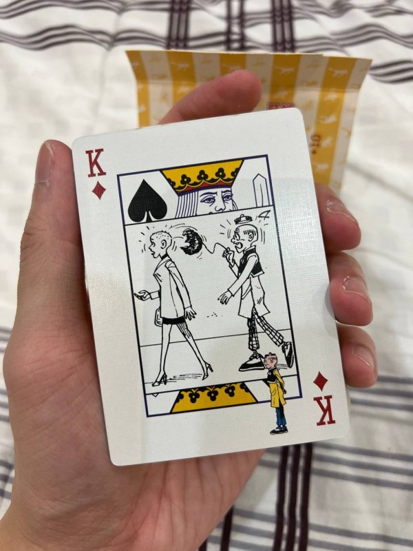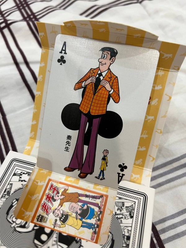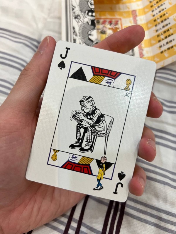 The cards for the Gilded Edition is designed with a lot of customization. The Pips and Courts are overlayed with comic panels - totaling up to 10 comics to be discovered. The Aces features the iconic characters: Old Master Q (老夫子) / Big Potato (大番薯) / Mr. Chin (秦先生) / Mr. Chiu (老趙). On the bottom right corner side, there is a small illustration, which when the cards are riffled, you can see Old Master Q walking. Although, the Courts behind the comic panels are all from the Spades [an overlooked mistake during designing].