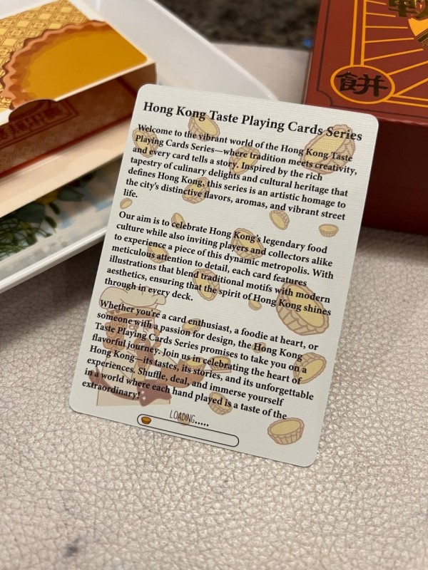 Gabangel presents Hong Kong Taste Playing Cards Series. This deck features one of Hong Kong's famous pastry: egg tart. Whether it is sold by vendors in the street or served in a restaurant, this delicious meal is very iconic. To comply with the theme, the cards will be scented - it has a bit hint of the smell from the delicious pastry.