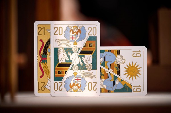 The Tarocco Genovese is a 79-card bridge-sized deck, including 21 trumps, 16 court cards, and 40 numerical cards, plus a Fool and an Invexendon, tribute to an unnumbered trump mentioned by Sir Michael Dummett in his list of Unresolved Problems Concerning Tarot and Italian Cards. The set also includes a companion booklet written by Jean Maillard, who co-created the project.