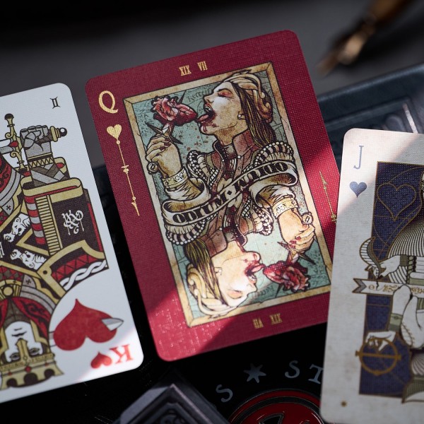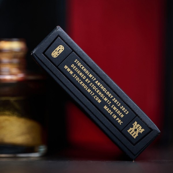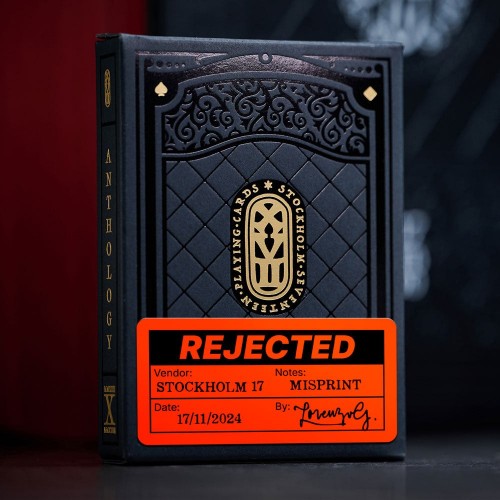 This deck of cards is a miniature tribute to the S17 Anthology Soft Cover, celebrating a decade of playing card design. It features face cards sourced from Stockholm17 decks released over the past ten years. Each card showcases unique artwork, reflecting an evolution in design from modern minimalism to intricate classics, making it a collector’s gem and a captivating visual journey. The Anthology deck was created to compliment the S17 Anthology book and was included in the 2024 Annual Patreon Reward. The deck uses faces from every S17 series from 2013 to 2023. The Rejected version features a debossed black tuck with gold and black foil and cards with gold foil.