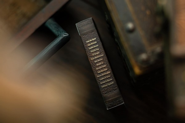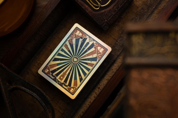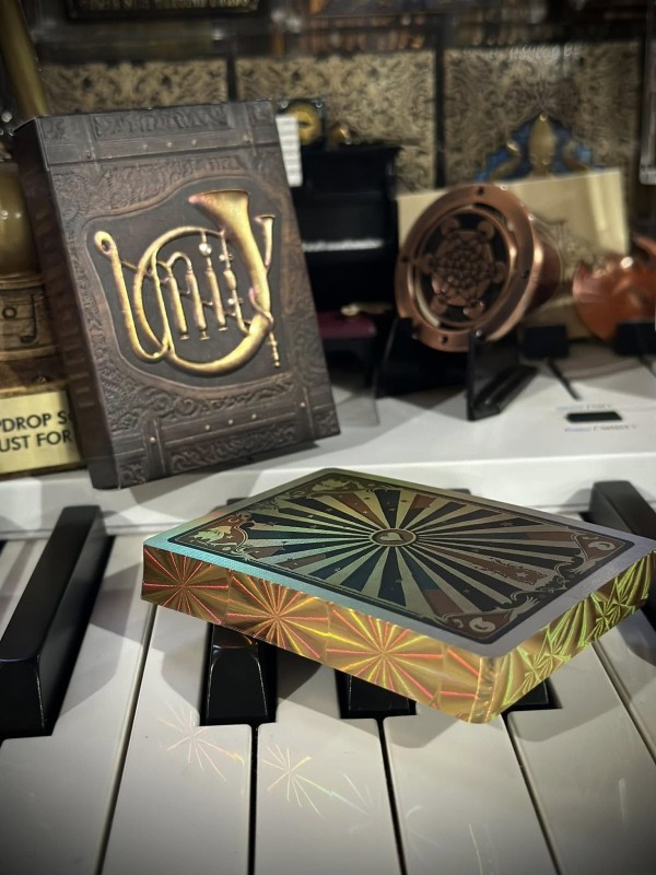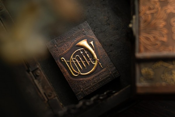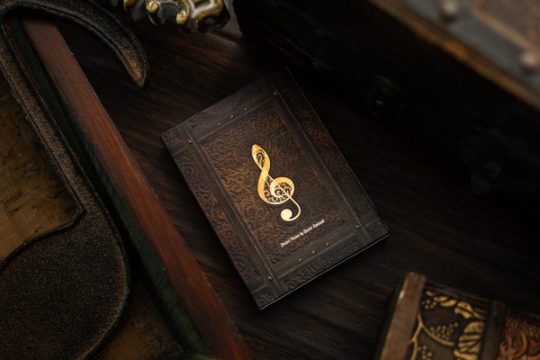 The Tuck Box is made of premium stock with multi-levels of embossing and debossing along with metallic foiling. It is designed to look like a vintage treasure chest containing a collection - a symbol of unity. The front side shows an embedded trombone, while the back side shows a treble clef plate. The sides of the box are engraved with all the designers involved with the deck. The interior of the box will have the same pattern as the front, and it is also foiled.