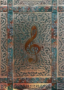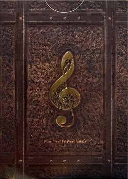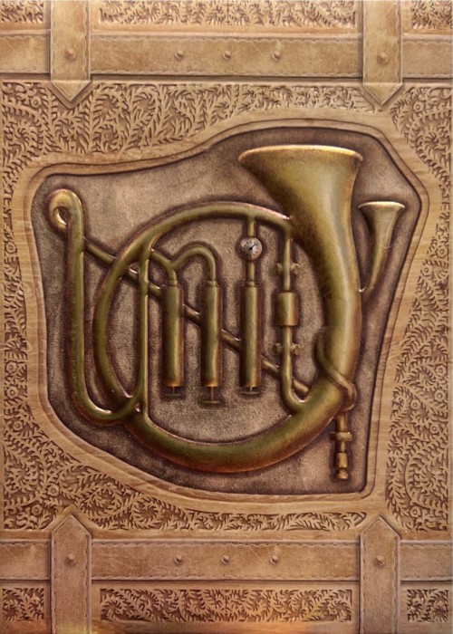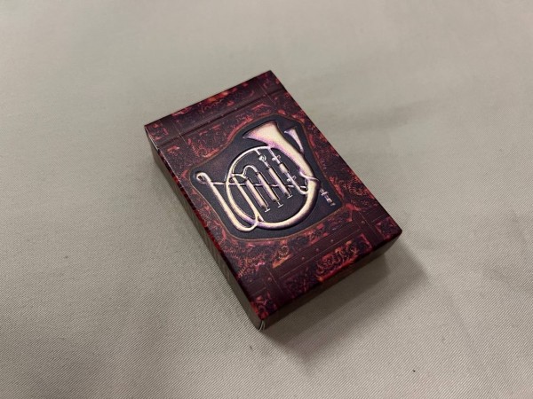 The Tuck Box is made of premium stock with multi-levels of embossing and debossing along with metallic foiling. It is designed to look like a vintage treasure chest containing a collection - a symbol of unity. The front side shows an embedded trombone, while the back side shows a treble clef plate. The sides of the box are engraved with all the designers involved with the deck. The interior of the box will have the same pattern as the front, and it is also foiled.
