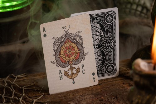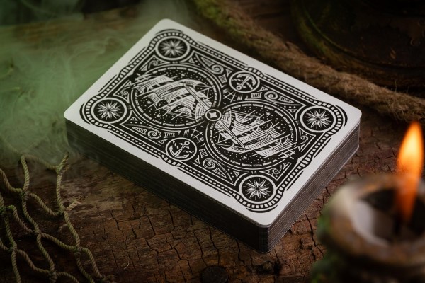 The star of the show: Albatross No. 6 Gilded Playing Cards continues the story of the ill-fated Albatross, lost at sea and cursed to roam forever in ghastly form. All the artwork from the No. 5 deck has been redrawn by hand for this collectors edition deck, featuring deep black gilding on the edges of the cards, skeletal Courts and a fully foiled tuck in ghostly green.