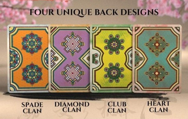 At the heart of "Ronin" are four distinct Samurai clans, each represented in its own deck: the Spades Clan, the Hearts Clan, the Clubs Clan, and the Diamonds clan. Each clan is brought to life through intricate, one-of-a-kind artwork, with a unique back design tailored to their story and symbolizing their fierce loyalty and strength. Each clan has it's own emblem, and it is reflected on the back of the tuck box and the respective back design for each deck.