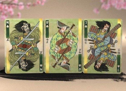The Aces feature samurai helmets adorned with metal accessories that has the shape of respective card suit. The back ground of each cards suit are colored respectively. The indices has Japanese characters of the number and ranks. The Number Cards feature custom pips: suit drawn using traditional brush strokes. The Courts feature two-way illustrations of Japanese warriors jacks, geisha queens, and samurai kings. The Jokers feature identical illustration of demon masks, colored red and blue respectively. The extra two cards form "Ronin" in stylized Japanese characters. For the artworks, on every metallic details (such as the weapons or armour metal ornaments) along with the golden strips on every card are finished with gold cold foiling.