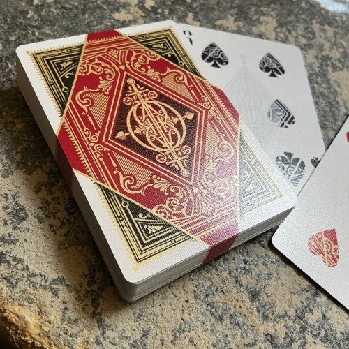 Redemption Players Playing Cards is a classic standard yet custom deck of cards designed by Lotrek. It is inspired from "REDEMPTION STORIES"; Patreon exclusive deck series only available to Oath Playing Cards patrons - notice how the broken border back design is a diamond shape which is a reference to the die-cut window of the deck series deck sleeve. The cards printed using CMYK plus gold and silver metallic inks. Featuring my latest take on the standard courts, the decks are visually special and classy, while still very player-friendly. The tuck box is made of matte stock with embossing and three different metallic foil.
