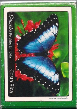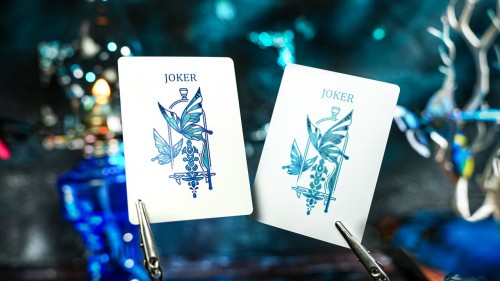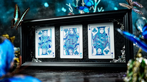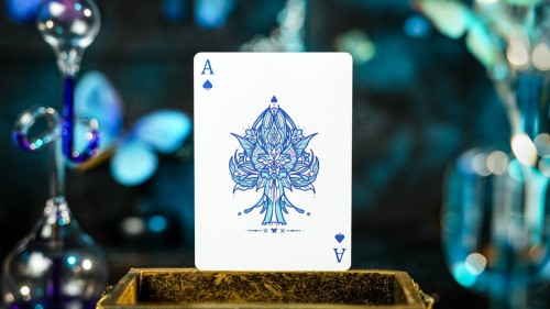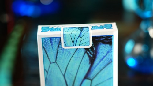 The butterfly that inspired Prism is the Blue Morpho, known for it. When light touches its wings, it triggers a range of optical effects. To capture this iridescent brilliance, we applied a unique cold foil technique over a deep blue background, echoing the shimmering beauty of its natural wings. On the tuck box, we used vibrant colors combined with blue foil to simulate these optical phenomena. The deck's color scheme is blue, with the back featuring the fragment of a Blue Morpho wing.