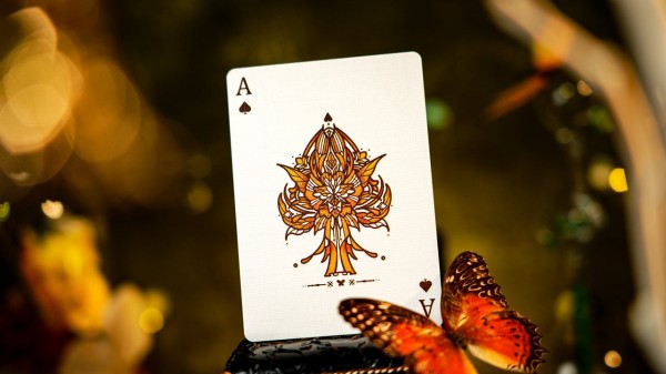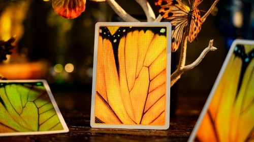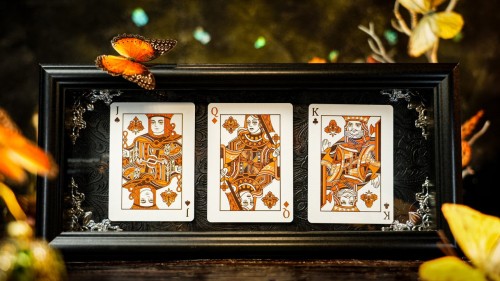 The Monarch butterfly, featured on the Amber Playing Cards, is the only butterfly on Earth known for its extraordinary long-distance migration. As light shifts, the radiant golden tones shimmer against the stark black-and-white patterns, producing a vivid contrast that captures both the monarch’s regal presence and the intricate elegance of nature’s design. On the card backs, a refined cold foil technique brings this wonder to life. The deck's color scheme is orange, with the back featuring the fragment of a Monarch butterfly wing.