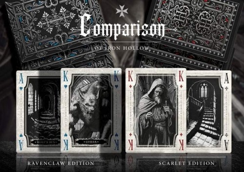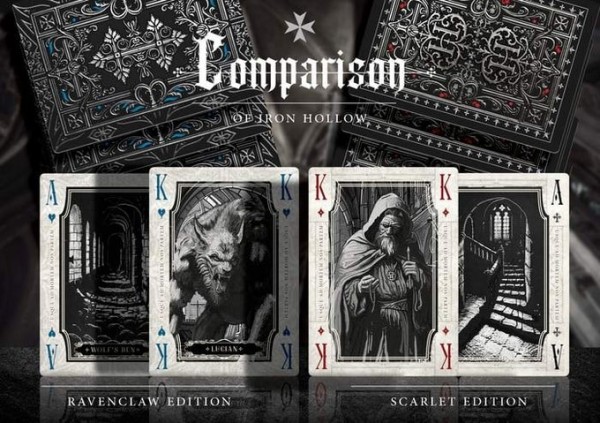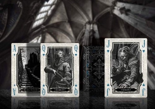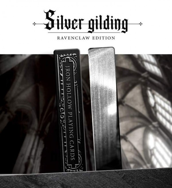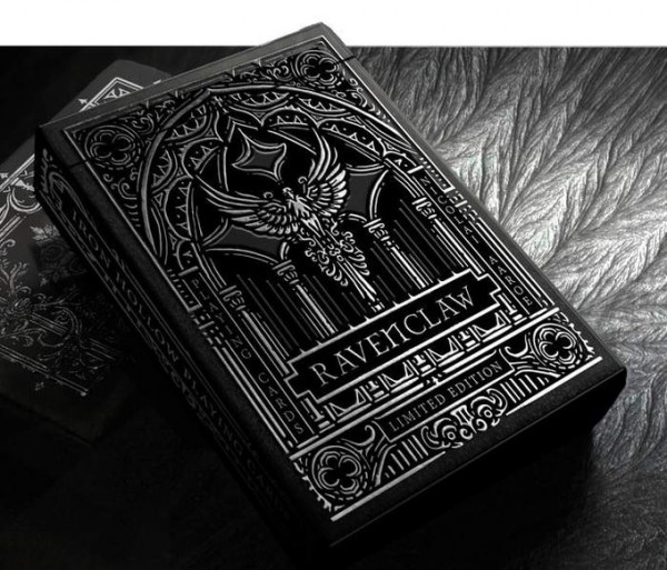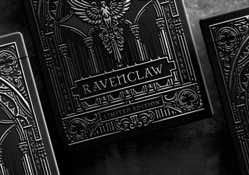 Ravenclaw features tuck with gothic ornamentation, taking inspiration from gothic portals of mausoleums and Victorian tomb stones, while featuring an iconic raven. It is manufactured with black and silver foil, strategically embossed on a matte, black stock. The red cards color is swapped to blue, and the cards have silver foil gilding.
