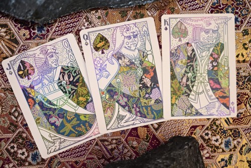 This Patreon 250 Edition is very exclusive to the patrons of Jack Brutus Penny Patreon - The sleeve is silver metallic foil with red embossed artwork and the pattern featured is wisterias & silkworms. The cards are gilded with silver metallic foil - the deck is that of Dyed Patternwork variant; dual-pattern back of lilies & ladybirds in blue/turquoise/white with thymes & tiger beetles in red/green, silver holographic cold foil faces