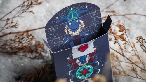 The tuck box shimmers with red and blue foil accents, creating an elegant look worthy of Krampus himself. Inside, you’ll find an informational card about the legend of Krampus and a double-backed gaff card for magic or use as a cut card during gameplay.