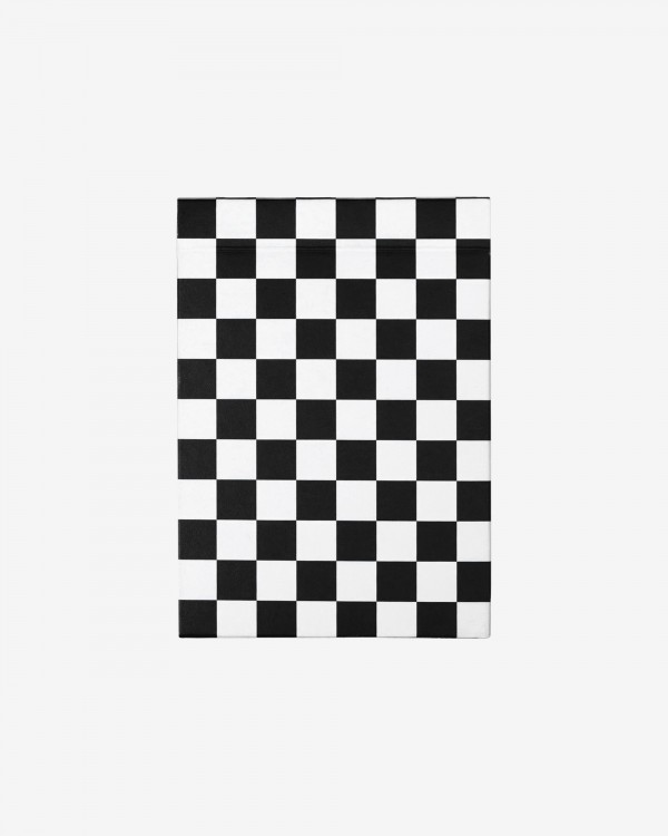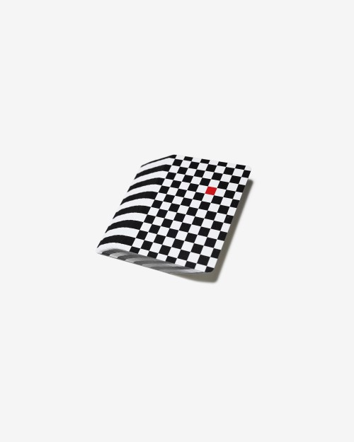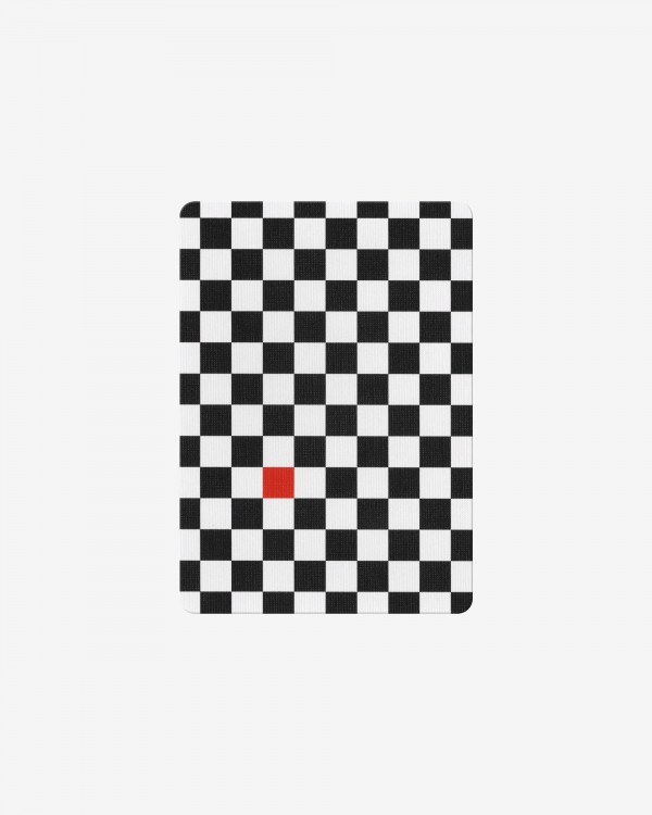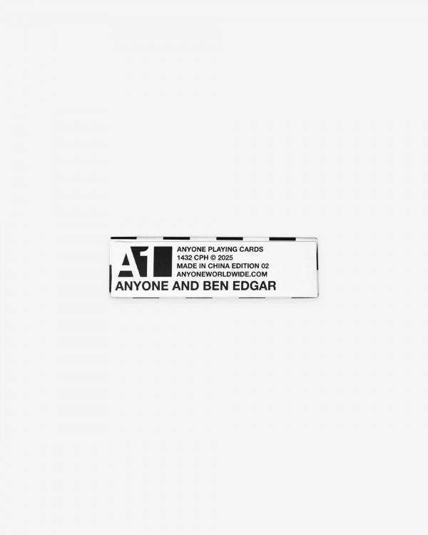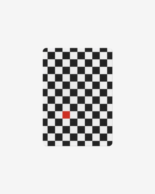 VERSION 2 - Released in 2025, only 500 decks made. Tuck box is made of matte stock with black colored text which are debossed. Back design is borderless black Checks with off-red square. Printed in WJPC.