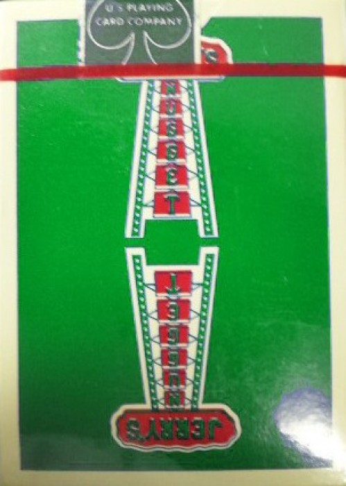 This is an unauthorized reprint, also known as counterfeit. The primary obvious method of detection for this particular deck is the original decks only came in blue and red, green was never created. While the methods to create these forgeries may change and improve over time, here are some previously known differences to help identify fakes - http://www.leeasher.com/playground/articles/how_to_spot_fake_jerrys_nugget_playing_cards.html