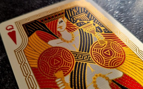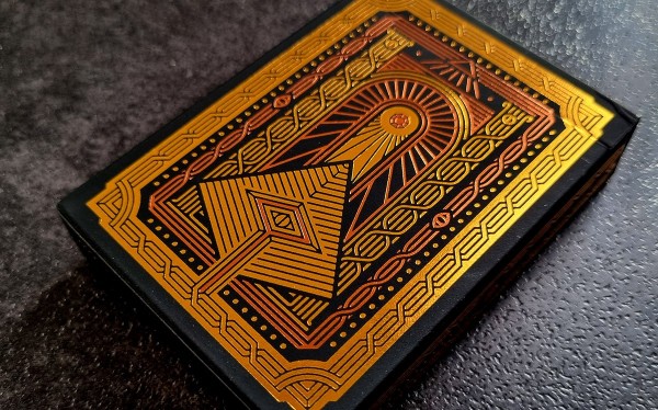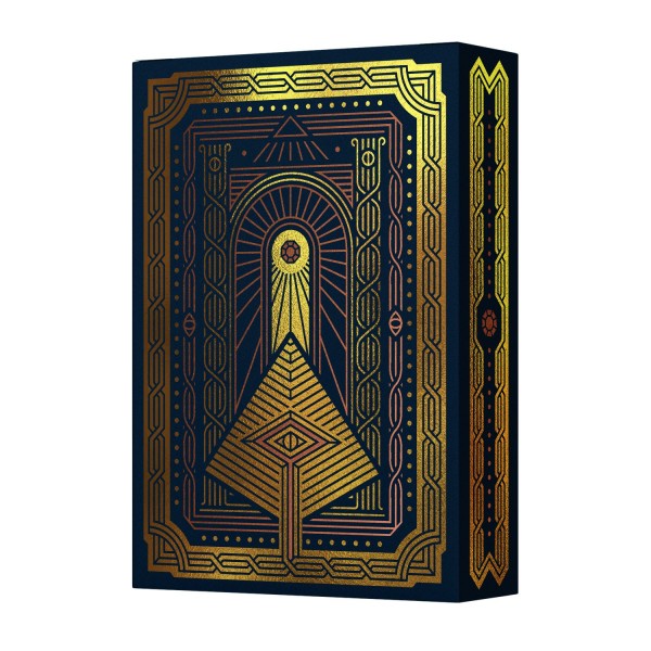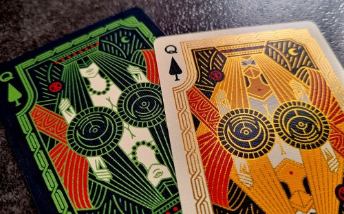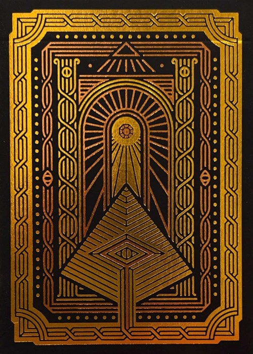 The tuck boxes are printed on dark, soft-touch premium paper with two foil colors. The cards are printed with inks and a layer of hot foil on both the front and the back - each deck has foil that matches one of the two colors on its tuckbox. There are two different designs and six color variants, making each deck truly unique. The decks are printed by WJPC - each variant is around 400 decks made.