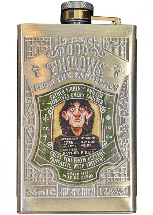 The Odd Fellows from the Sanctuary are the latest additional members of the unusual freaks club by Stockholm 17. The decks feature criminals in disguise of religious people with their heist plan to steal priceless artifact. The Numbers can form a bigger picture of the scheme, and The Courts are heist members. The Jokers and Extra Cards feature the titular character of their respective editions along with the troupe's base of operation. The tuck box is out-of-the-ordinary, yet fits the lore of the series - the cards are tucked in a sleeve which is encased inside a fake imitation metal hip flask. In addition, the cards have their own back design, but the faces remain the same throughout, and the cards already gilded with metallic foil. It is the most thematic Odd Fellows members as of now.