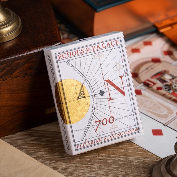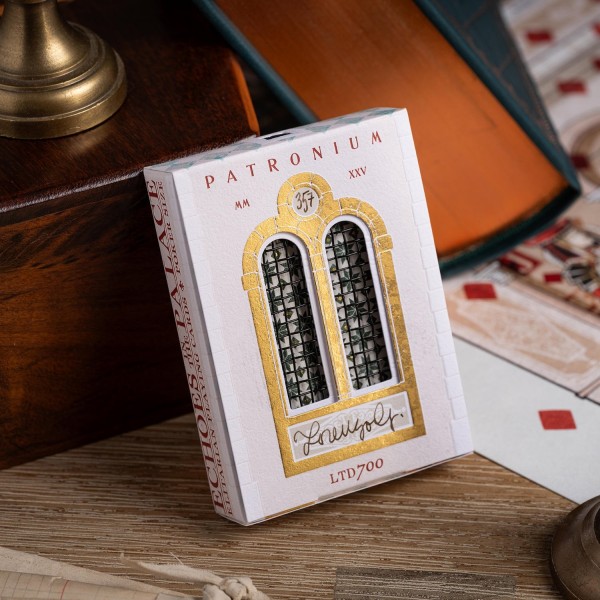 The tuckboxes feature progressive number and signature with fountain pen, numbered and signed with care one by one. It is a box with a full-length flap with embossed and foiled artworks, and it is designed to integrate parts of the palace onto the box. The back side of the box is thick, as it is designed to show an actual metal-grated window - embossed bricked walls and window frame with die-cut holes and REAL black metal wire mesh along with gold foil decoration pattern with a strolling black cat. The full length flap mirrors the window, with the framework done in gold and there are spaces for the hand numbering (on the small circle) and signature (bottom side of the window). Also, the top of the flap has a small square die-cut hole which is to view the gilding of the cards - the deck is gilded with turquoise foil. The front side of the box, which extends to the right side, is a miniature sundial - complete with a small pop-up triangle. The interior of the box has an extra backdrop featuring Latin inscription, and you can see them through the grated windows when the cards are out of the box.