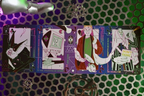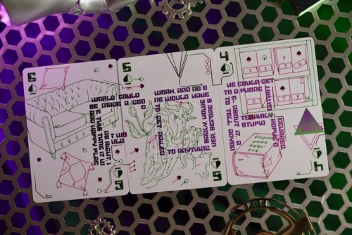 The Infinite Improbability Deck is a full-bleed, deck of art poker playing cards. Each of the 54 cards is adorned with original illustrations that capture the essence of the Hitchhiker universe. From the perpetually depressed Marvin the Paranoid Android to the two-headed, three-armed ex-Galactic President Zaphod Beeblebrox, every card is a minor masterpiece. The Courts feature iconic characters from the story, and they can be arranged into one full-length poster. The Numbers can be connected to form a message. The Back Design is the galaxy and journey our hitchhikers' stories follow - done in holographic hot foil.
