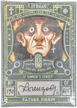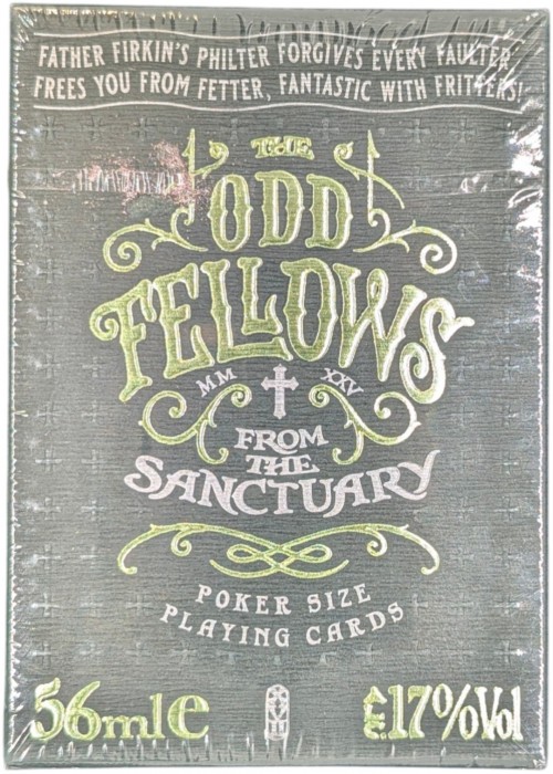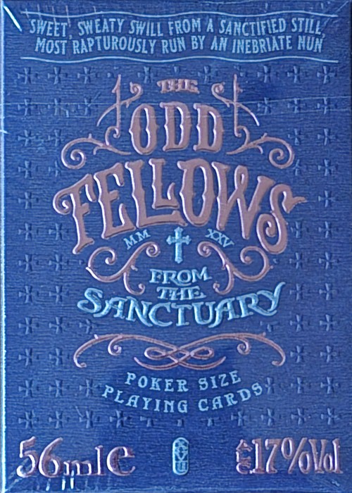 The Odd Fellows from the Sanctuary are the latest additional members of the unusual freaks club by Stockholm 17. The decks feature criminals in disguise of religious people with their heist plan to steal priceless artifact. The Numbers can form a bigger picture of the scheme, and The Courts are heist members. The Jokers and Extra Cards feature the titular character of their respective editions along with the troupe's base of operation. The tuck box is out-of-the-ordinary, yet fits the lore of the series - the cards are tucked in a sleeve which is encased inside a fake imitation metal hip flask. In addition, the cards have their own back design, but the faces remain the same throughout, and the cards already gilded with metallic foil. It is the most thematic Odd Fellows members as of now.