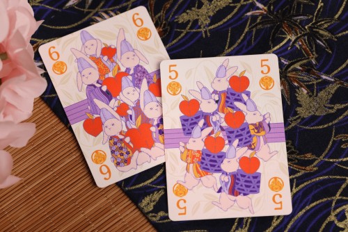 These Number Cards capture the joyous assembly of hares as they herald the coming of the gods. Each card features a unique hare, celebrated in a moment of reverent anticipation. The number cards feature a transformation deck, where the pips elegantly evolve into rabbits. When fanned or laid in sequence, the cards reveal their true magic: Straight bars representing the strands of fate run through each card, connecting to form an endless, unbroken panorama, a visual testament to the divine bonds of en. This continuous connection can be fully appreciated when displayed as a beautiful uncut sheet.