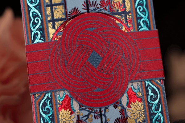 The card back design is a masterful fusion of two potent motifs: the sacred shimenawa rope, representing the binding connection of en (fate), and the protective form of the omamori knot (御守結び), symbolizing the blessing and guidance offered by the divine. This hybrid design creates a "Knot of Fate" centered on each card, flanked by two omamori knots from the corners of the cards. When fanned or flipped, the deck performs its own magic. The intricate corner omamori knots appear to spin and whirl to life. This creates the mesmerizing illusion of an endless sacred bond connecting all. It brings to life the very essence of the Month of the Gods, where every shuffle becomes a ritual, and every deal is guided by the threads of divine connection.