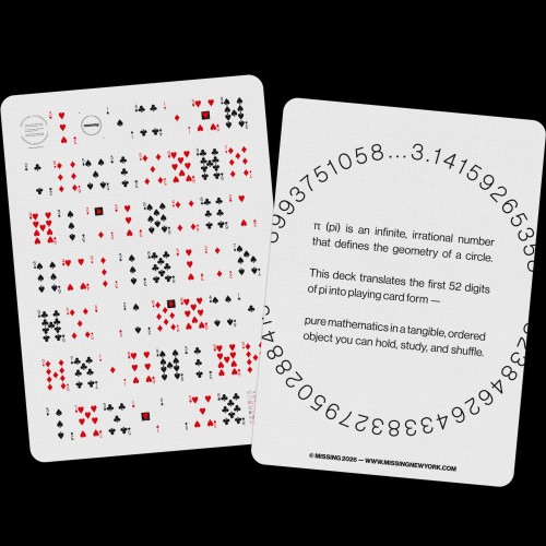 π (pi) is an infinite, irational number that defines the geometry of a circle. This deck translates the first 52 digits of pi into playing card form.