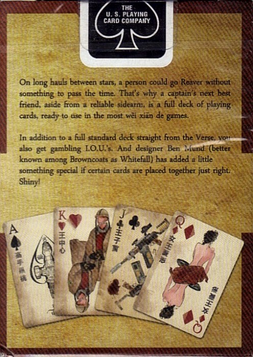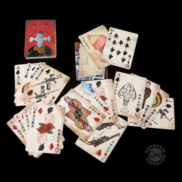 QMx teamed up with renowned Browncoat artist Ben Mund (of Serenity Blueprints and Atlas of the Verse fame) and Bicycle to create the first-ever officially licensed Firefly Playing Cards. The deck consists of the standard four suits of 13 cards each plus two jokers, and features designs that are anything but standard.