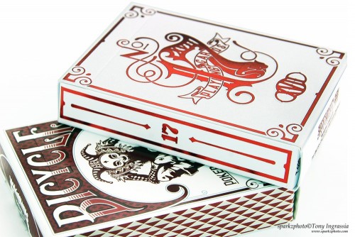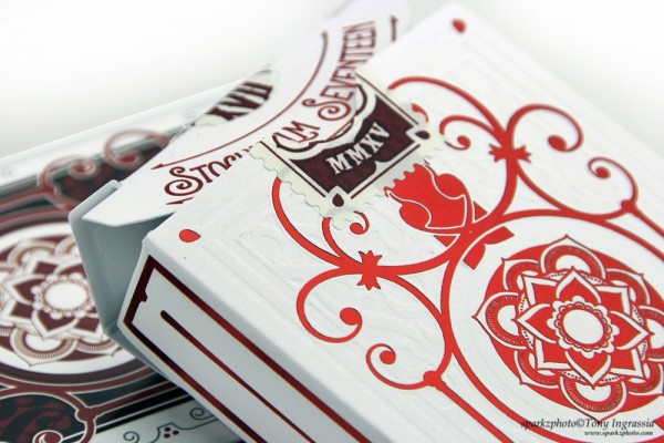 For this project the deck was revised with new and modified face cards, back and tuck and was available in Bicycle branded, unbranded, plus a special Crown Edition hand created tuckcase with the same size and face cards. It was printed by USPCC on Bicycle Stock with 56 cars including 3 jokers and a gaff card with a custom seal and embossed tuck used on both decks. The deck as also available as an add-on in uncut format. In addition, mini and micro formats were available as gifts with larger sized tiers which were printed by MPC (MakePlayingCards.com).