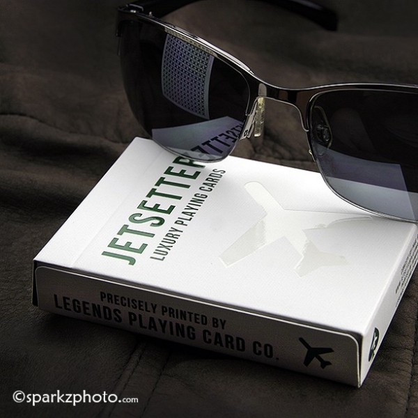 The playing cards showcase re-colored standard faces with a classic and casino inspired back design. They're traditionally cut utilizing Legends' famous 'Diamond Cut' process, a closely guarded secret that distinguishes these playing cards from other brands. The tuck box has clear UV spot varnish accents on the text and defines the airplane icon on the front, creating a classy and elegant feel one the matte white tuck box.