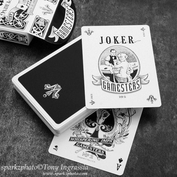Lastly, it was important to set this deck apart from the original while maintaining elegance. The original Whispering Imps® sported a very intricate back design and were housed within a very simple, iconic tuck box. The Gamesters incorporate just the opposite - a very simple and iconic back design and an intricate, elaborate tuck box.