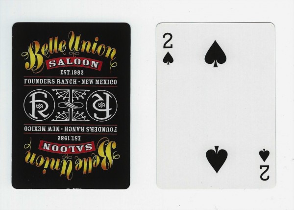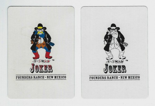 Produced for members of the Single Action Shooting Society. Tuck box is white with no printing; back is cut out to show card back. Jokers are custom and different colors. Card faces are standard.