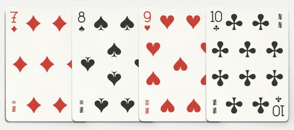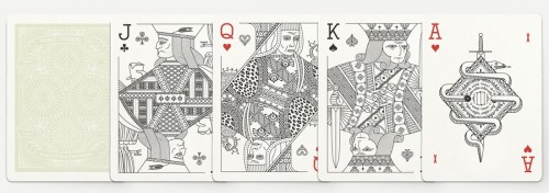 It has beautifully colored card backs and tuck case. In addition, the red colored pips for Diamonds and Hearts form an intriguing contrast with the black design, particularly with the court cards.