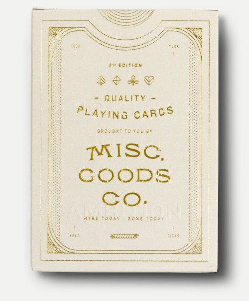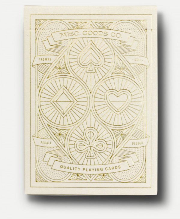 The deck is manufactured by the United States Playing Card Co., and is printed on Bee paper, the highest quality coated playing card stock. The tuck case is printed with ivory ink, gold foil and is embossed.