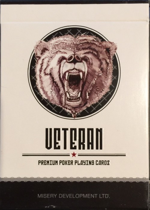 VETERAN (LIMITED EDT = 1,000 decks) has a striking appearance with deep black and piercing red ink contrasts for the suits. Court cards have 12 imaginary legends portrayed in black and white illustrations. The 'veterans' are iconic rangers of a post-apocalyptic world that seek to regain peace, balance and prosperity. All pips have sharp stars in them for ornamentation.