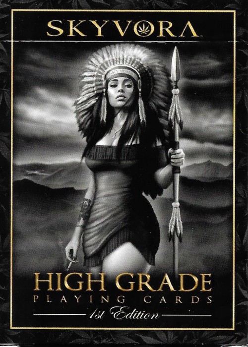 An elegant marijuana-themed playing card deck. The Skyvora High Grade Playing Cards feature 18 custom illustrations that serve as representations of popular marijuana strains.