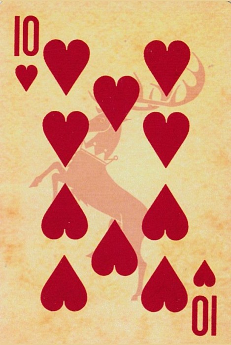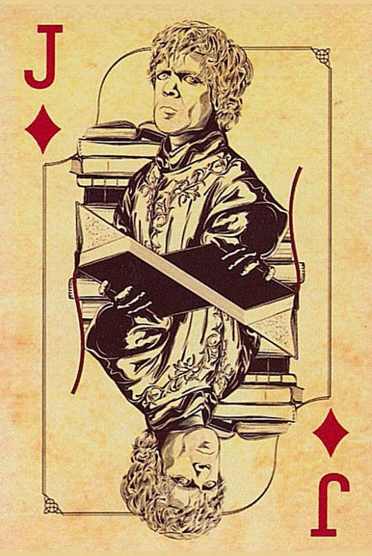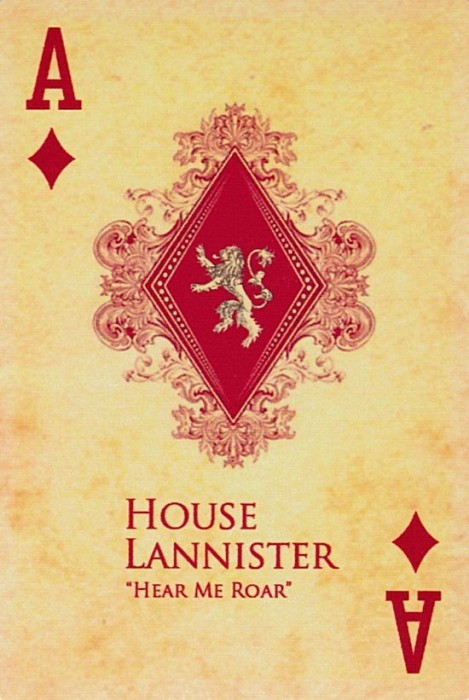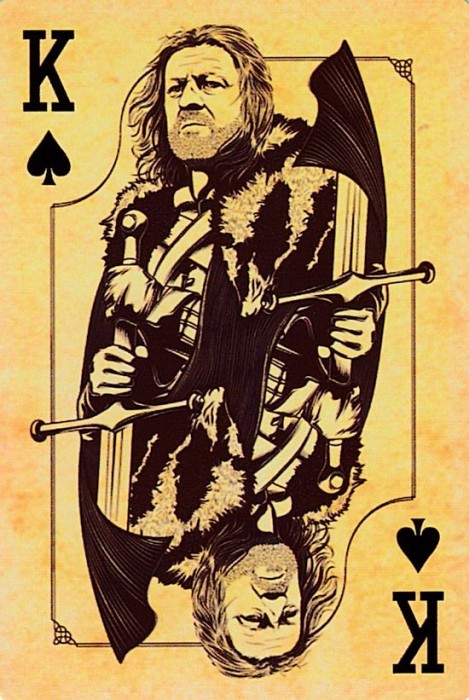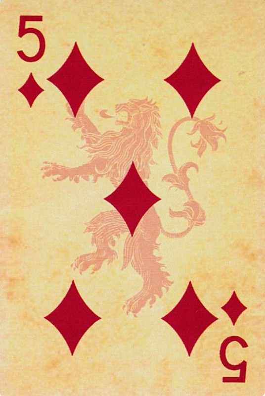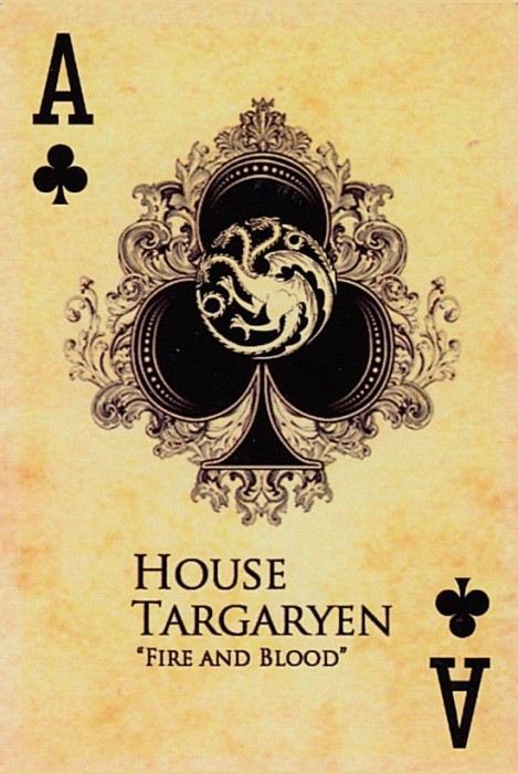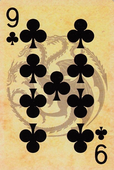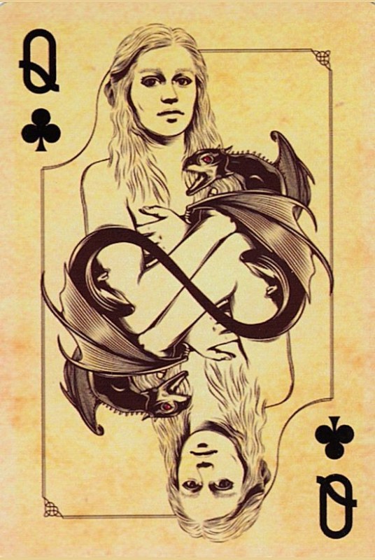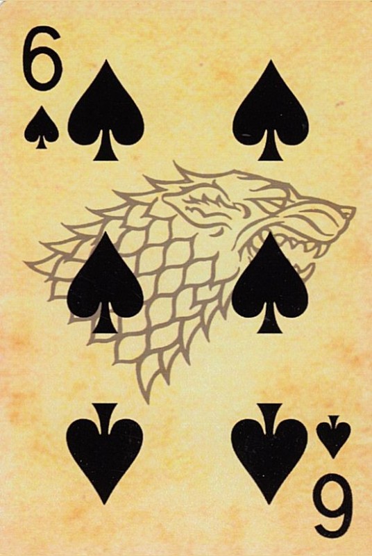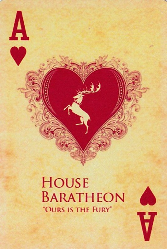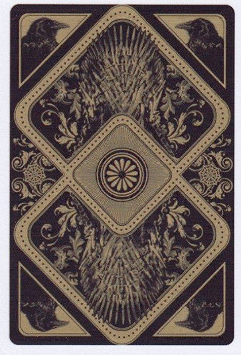 Based on the HBO fantasy series. Each suit represents a royal house of Westeros. Clubs:Targaryen Spades:Stark Diamonds:Lannister Hearts:Braratheon. Cards are presented in a tin container. Court cards feature starring characters of the four houses. Scanned Images of each card can be viewed here:http://www.marytcusack.com/maryc/decks/html/Cards/GOTWOD.html